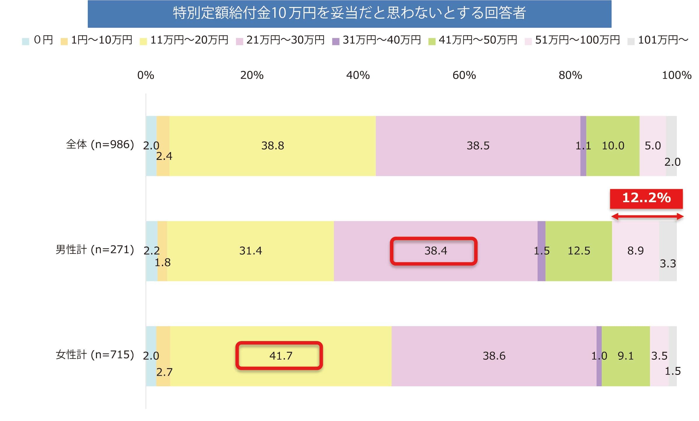 - 妥当だと思わないとした回答者のうち、男性は21万円〜30万円、女性は11万円〜20万円を求める割合が最も高い。