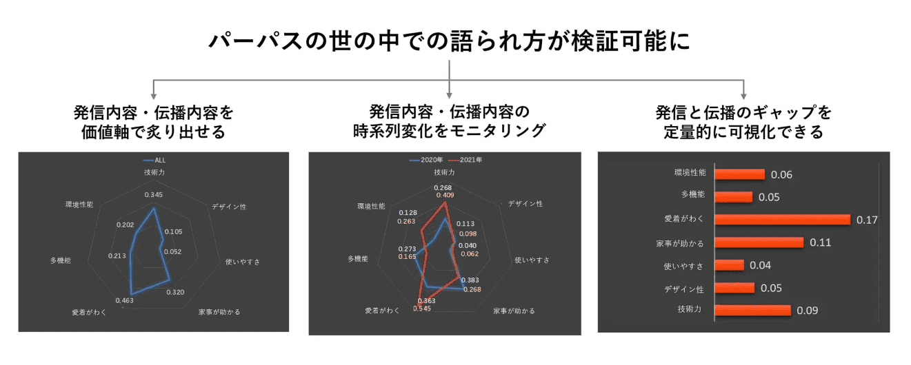 架空の家電メーカーブランドのパーパスを構成する価値を7つの軸 (技術力、デザイン性、使いやすさ、家事が助かる、愛着がわく、多機能、環境性能) に整理し、各軸について「社外の生活者によるSNSでの発話」と「自社からのニュースリリースでの言及」をスコア化。「企業からの発信と社会の反応のギャップ」を可視化したり、「自社からも実はしっかりと発信できていない価値」を把握したり、定点でスコアをとり「アクションによってどのように変化があったか」を測定したりといった分析・行動が可能に。