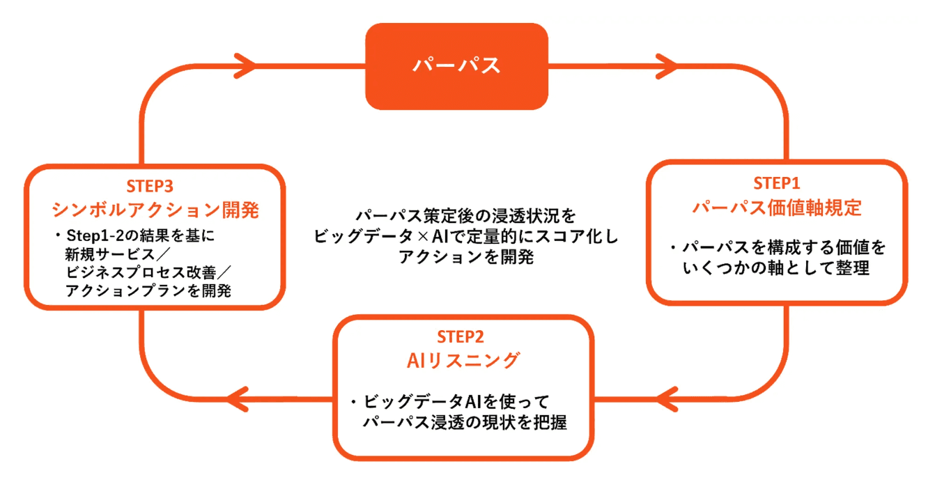 「パーパス・アクション・サイクル」の3つのSTEPを循環することで、企業と顧客・社会との双方向・持続的なコミュニケーションが可能になり、真の意味での「パーパスの実践」を推進します。パーパスドリブンな組織風土への変革、生活者や世の中とのパーパス共有などのビジネス活動の効果を測定しながら、企業/ブランドの発展を支援いたします。